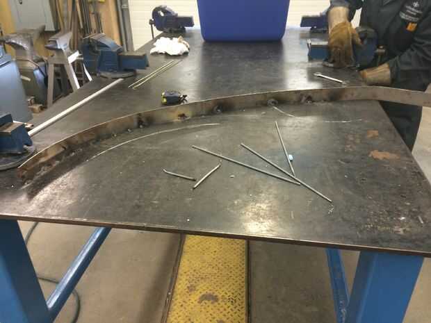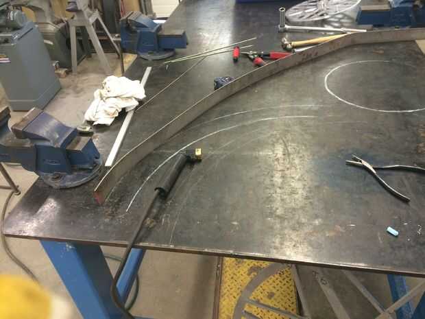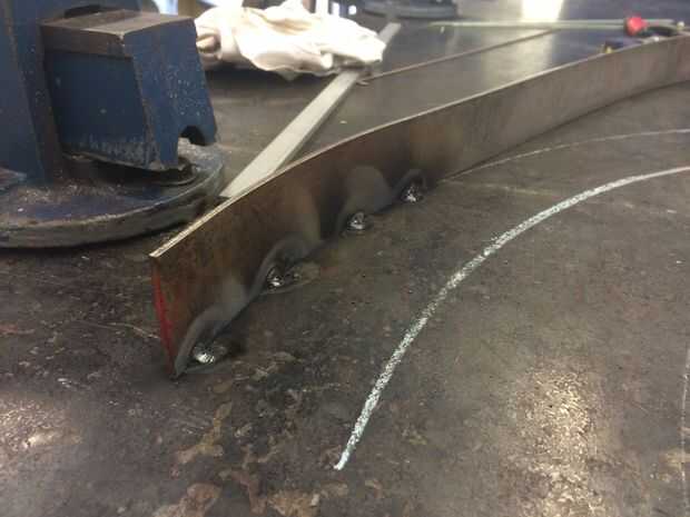 La composición de la plantilla fue hecha de un trozo de barra plana que fue punto soldado con autógena a la tabla siguiendo el arco dibujado anteriormente. Durante el procedimiento de soldadura, necesitaba una mano para empujar suavemente el piso bar poco a poco para lograr el arco deseado. El tipo de soldadura utilizada para esta operación era soldadura al arco con una varilla de soldadura 7018.