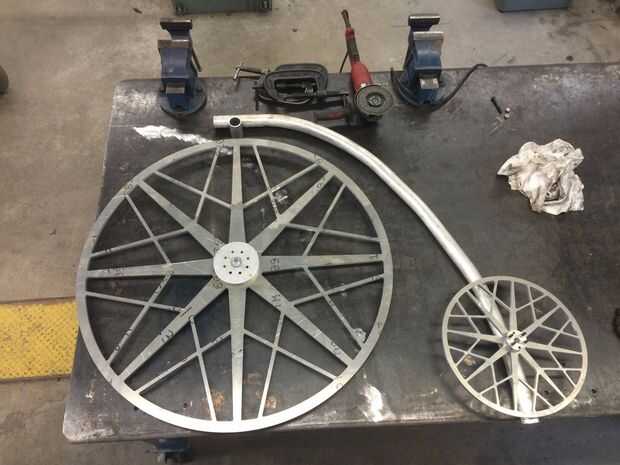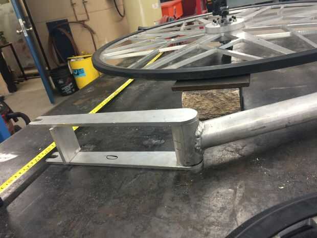 Las horquillas fueron mucho más difíciles de lo previsto. En la fase de planificación, horquillas delanteras y traseros tenían una forma de zapato de caballo en el final que se ancla por un tornillo a cada lado que sería emparedado de los cubos. Sin embargo este plan no hubiera sido capaz de trabajar con las horquillas más grandes debido al gran peso en esta área crítica. En cuanto a la configuración con los tenedores pequeños, coloque ambas ruedas en la mesa para estar perfectamente nivelado. Luego, tomar el cuerpo y ponerlo a la altura deseada por encima de las ruedas. Después de que el cuerpo y las ruedas están alineadas, medir la parte superior de la barra de conexión para el centro de la rueda trasera. Luego tomar un aluminio barra plana ¼ de espesor y cortar a la longitud deseada. Para un aspecto elegante y unificado, redondea los bordes para seguir el diámetro del tubo conector y entonces gradualmente de la forma cónica hacia abajo para abrazar el tamaño del perno del eje trasero.