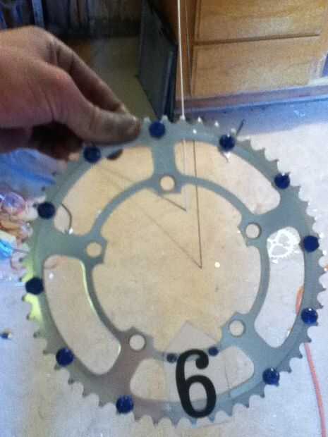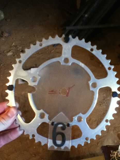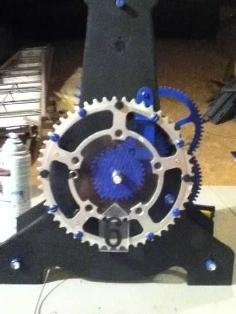 Esto se está poniendo muy cerca de terminar. Esta es la parte donde usted puede fácilmente aventurarse a personalizar reloj de usted. Mi placa frontal está hecha de un engranaje de piñón de bicicleta vieja. respaldado con plexiglás. Perforé 12 agujeros y a poner negros y azules los pernos a través de ellos para los marcadores de hora. Consegui esto exacto tomando la cara de un reloj real y marcar las muescas individuales. Había tres espigas cortadas en segmentos que estaban pegados en la cara del reloj. Estos tacos eran lo que unido a la placa frontal fueron lo que monta la placa frontal a la parte frontal. Perforé dos agujeros a través del plexiglás, uno de los tacos que transfieren la energía de rotación a las manos y que sale justo a la izquierda de él. Este agujero que sale justo a la izquierda del mismo para la clave que usas para los engranajes de trinquete.