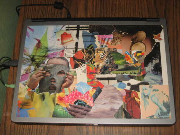 Utilicé cinta adhesiva para cubrir el logo en el centro para que nada se filtre a través y también usa cinta adhesiva para hacer los bordes aseados. El collage nunca la pantalla u ordenador negativamente.