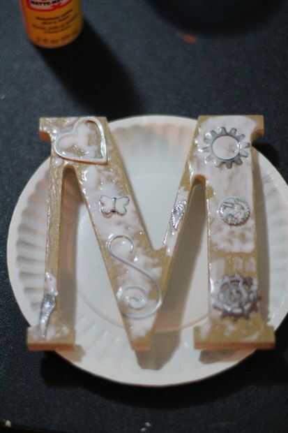 Uno tiene su primera capa de modge podge, colocar tus adornos donde quisieran. Elegí los engranajes, las alas, un corazón y una "S". Elegir lo que adapte a su gusto. Tiempo de Consejo útil... Asegúrese de que los adornos que usted elija ponen ras con su carta. Se adhiere mejor.