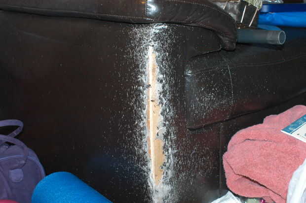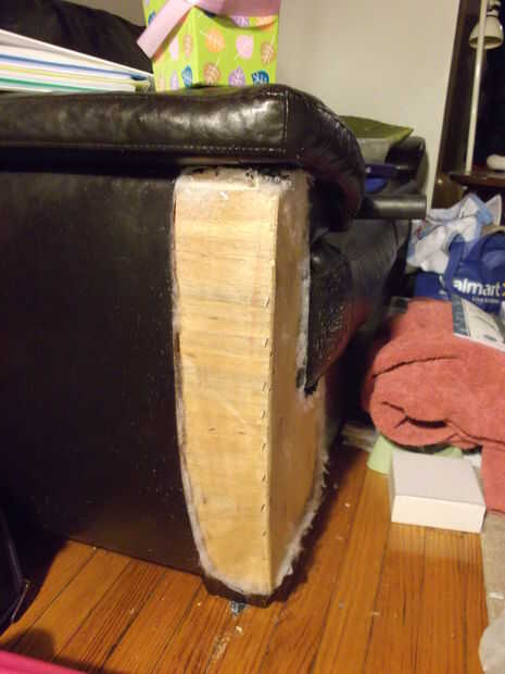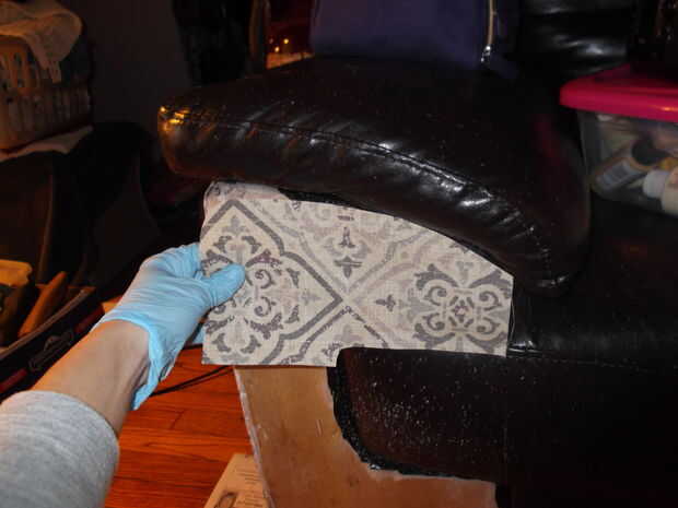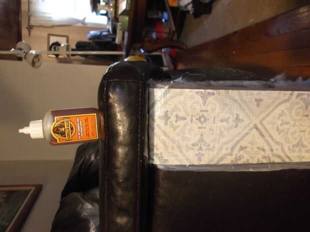 Luego llevó a cabo el "Modge Podge" y el pincel y había cepillado el material a la madera en el sofá. No seas tacaño con él! Entonces aplicar el "Modge Podge" en la parte inferior de la tela también. En este punto, se llevo a cabo el pegamento gorila y aplicó en la parte superior de donde yo estaba adherir la pieza de tela, así como a lo largo de los bordes según sea necesario. Hice lo mismo una vez que alisar cosas y había añadido pegamento del gorila en el borde inferior. Estoy contento que hice. Luego suavizar la tela con algún tipo de objeto cilíndrico - una tina de paños de limpieza, un cepillo para pelusa - nada - sólo asegúrese de suavizarlo fuera tanto como sea posible para deshacerse de las arrugas. Una vez hecho esto, entonces aplicar liberalmente "Modge Podge," en la parte superior de la tela de un todo que - incluso en los bordes de la tela sobre el sofá un poco. Ayudará a sellar.