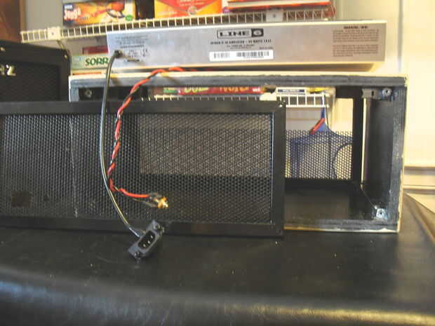 Cortar el cable original de alimentación y salida a altavoz y soldó el audio y tomas de corriente, las tuercas t gran puede quitar la parte posterior de la tapa siempre que quieras sin dañar la madera, el marco de madera para tratan de las tapas que los tipo de zanja o canal para deslizar la parrilla en.
