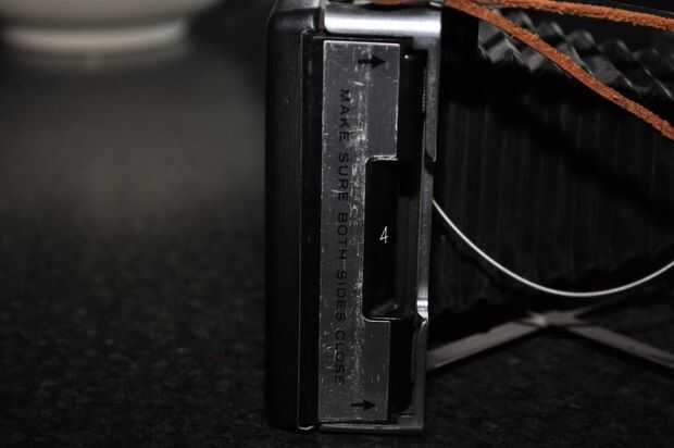 abrir la parte trasera de la cámara y poner el cartucho de la película en. NO TIRE DE LA PIEZA DE PAPEL SOBRE PELÍCULA!!!!!! Esto va a arruinar la película. Ponga el cartucho en la cámara y el papel por la ranura #4 del hilo de rosca y cerrar la cámara.
