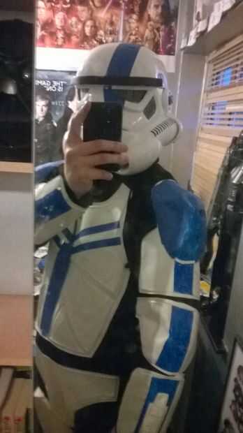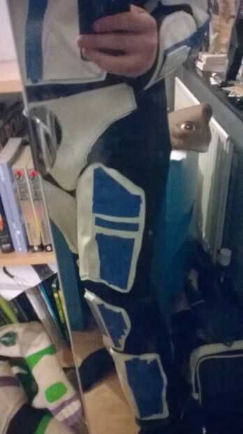 he intentado montar en cada detalle. significa cubre los hombros en azul total, agregó los detalles azules en el cinturón y tiene el detalle de la pierna.