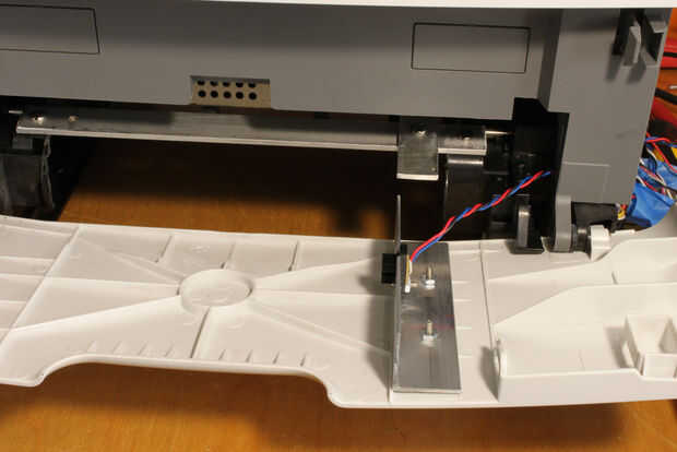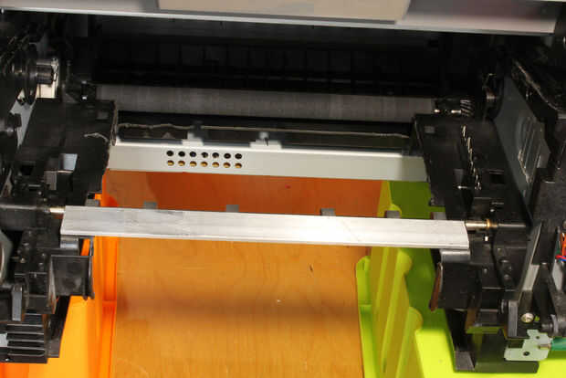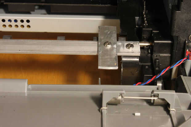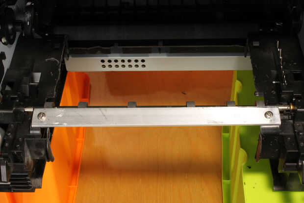 Coloque la barra de aluminio en la parte delantera de la plataforma de papel, presionando ligeramente sobre los rodillos y marque la posición de los agujeros. He utilizado un rotulador plata, pero podría poner alguna cinta de enmascarar sobre el área y use un lápiz para marcar los puntos. Taladre los agujeros en la plataforma de papel y Monte el soporte frontal del portador usando hardware de 8-32.
