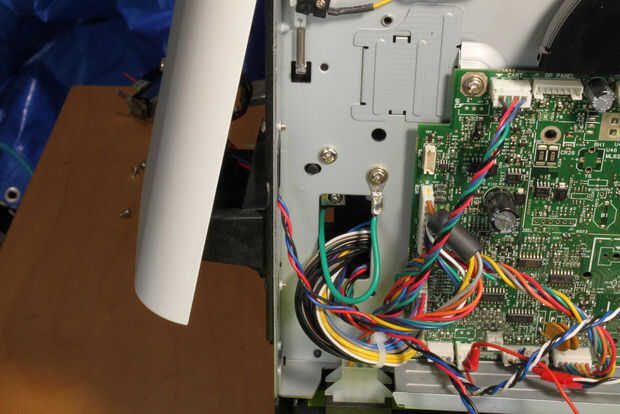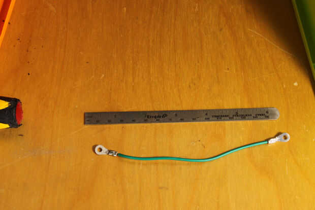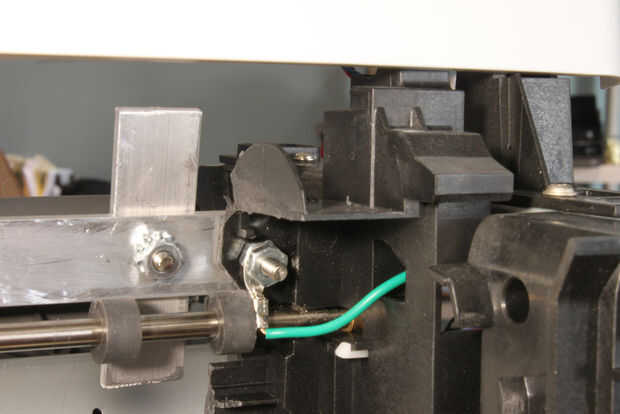 Tira de ambos extremos de un pedazo de 6 pulgadas de alambre y soldadura #8 anillo en cada extremo. Conecte un extremo al FCS derecha tornillo de montaje. Ejecute el cable a través de una abertura y en el gabinete de controlador. Utilizando uno de los tornillos extras, lo conecte a la impresora marco como se muestra. El tornillo que su propio hilo en el acero fino.