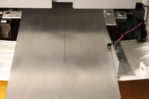 Si hay cualquier cantos de plástico en el borde de la parte delantera de la plataforma de papel, retire con un cuchillo o cortador de lado y liso.