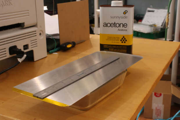 Como impreso, la línea se adhiere muy bien al portador, pero fácilmente ser limpiada con una toalla de papel. Para "fijar" en su lugar suspenderlo en vapor de acetona. En un área bien ventilada, vierta una pequeña cantidad de acetona en un vaso de bicarbonato plato o una lámina de aluminio "pan pan" que es al menos 8 pulgadas de largo. Coloque el transportador en la parte superior, grabado hacia abajo, hacia la acetona. Poner un pequeño peso en la parte superior para ayudar a sellar el portador al plato. Deja ahí 15 minutos, luego seque el portador al aire durante unos minutos. Esto fija el toner firmemente al portador. Si necesita quitar o reimpresión de la Cruz, sólo Limpie con acetona y llegará justo al lado.