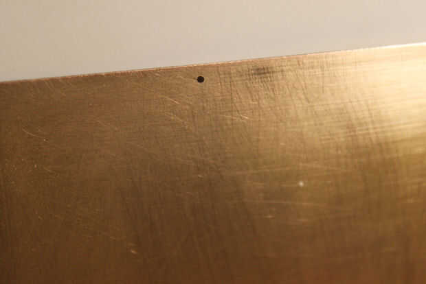 2 - Perfore un agujero pequeño (e.g..050 pulgadas) en esta línea media cerca de los bordes superior e inferior. Estos agujeros no debe estar perfectamente centrado en la línea media.