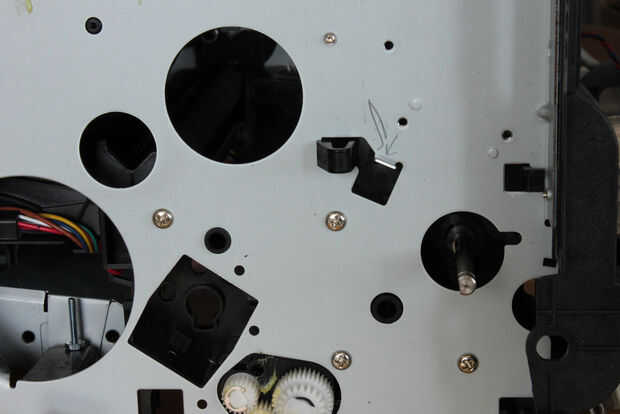 Retire a la guía de alimentación de papel con los 6 pequeños rodillos. Se llevó a cabo en lugar por 2 tornillos a cada lado, no por los 8 tornillos en la parte superior. Deséchela.