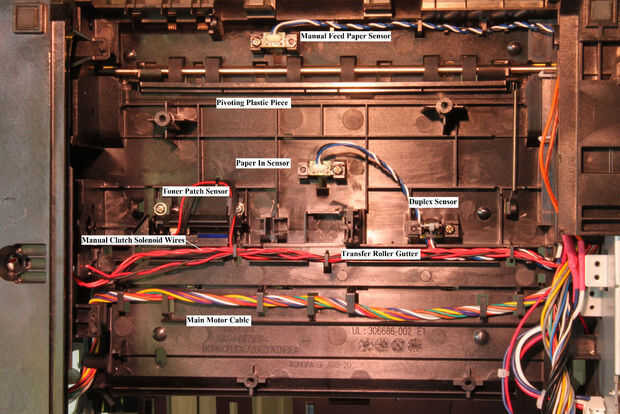 Quite el tornillo que sostiene el Sensor de papel alimentación de Manual (MFP) en su lugar. Corte el cable cerca del sensor y saque el cable en el compartimiento de control. Usted no necesitará el sensor pero necesitas el cable y el conector.