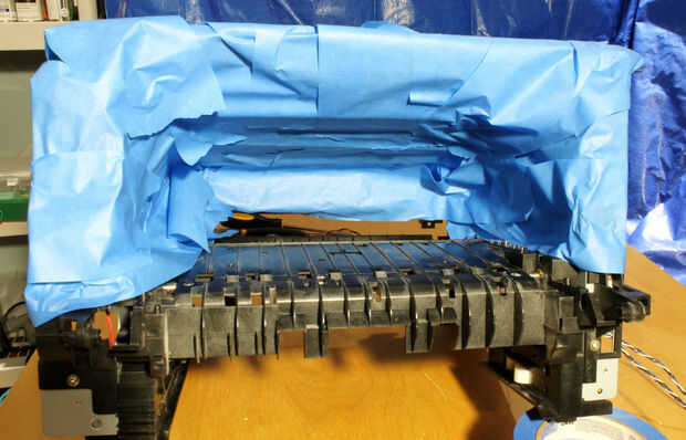 Deben cubrir las aberturas del mecanismo del laser. Utilicé tiras de cinta de pintor de cuatro pulgadas para cubrir todas las aberturas. También cubrí las áreas donde los chips podrían lodge y causar problemas más adelante mientras que impresión [Foto].