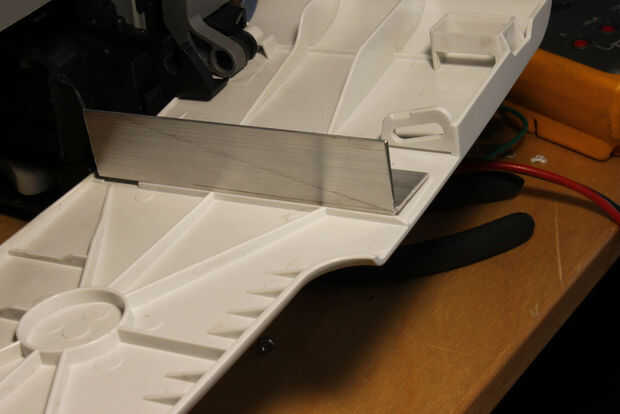 Corte un pedazo de 4.5 pulgadas de aluminio de ángulo de 1 x 1 pulgadas. Taladre dos agujeros de.125 pulgadas en una pierna del ángulo, centrada en la cara y 1,75 pulgadas aparte. Lugar el ángulo en el interior de la tapa frontal, centrado alineado con el plástico "canto" como se muestra y marque la ubicación de los agujeros. Taladre agujeros de.125 pulgadas y use 4-40 para colocar a la guía del transportista a la cubierta frontal. Alinee cuidadosamente la guía de portador con la cresta en la cubierta frontal. Vuelva a colocar la tapa frontal.