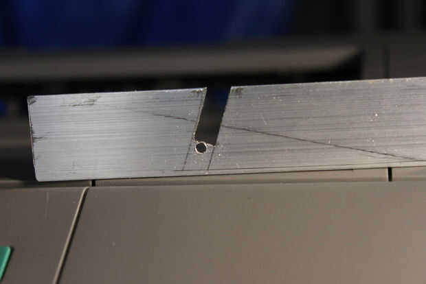 Ahora vamos a cortar una ranura en el centro de gravedad de la ISFL. La herramienta más fácil de usar es una cortadora como se muestra en la sección de la herramienta, pero también se pueden utilizar una pequeña sierra y un archivo. El tamaño exacto no es importante. Hacer la ranura profunda lo suficiente para que el centro de la abertura del sensor está centrado justo debajo de la línea que trazaste en la parte superior de la compañía. La ranura debe ser perpendicular a la línea de lápiz.