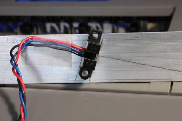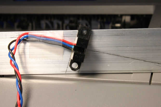 Se utilizará el Sensor estrecho de los medios de comunicación como el NPI. Se trata de un sensor en forma de U con un fototransistor (PT) en una pierna y un IR en el otro. Una fina raja en la carcasa de plástico permite un haz de luz IR ir desde llevó al PT. La salida es normalmente baja, pero cuando se interrumpe el haz va alta. Más tarde se perforación un pequeño agujero en el borde del portador para desencadenar el NPI.