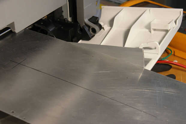 Corte el ancho x.016 hoja de aluminio de 6 pulgadas a 16 pulgadas. Lugar contra el portador de la guía (CG), descansando en la cubierta delantera con el borde delantero en el interfaz de los rodillos de entrada. Empuje el borde de ataque del portador en los rodillos de goma. Como se muestra en las fotos, utilice un lápiz para marcar el camino de la compañía en el centro de gravedad, luego quite el portador.