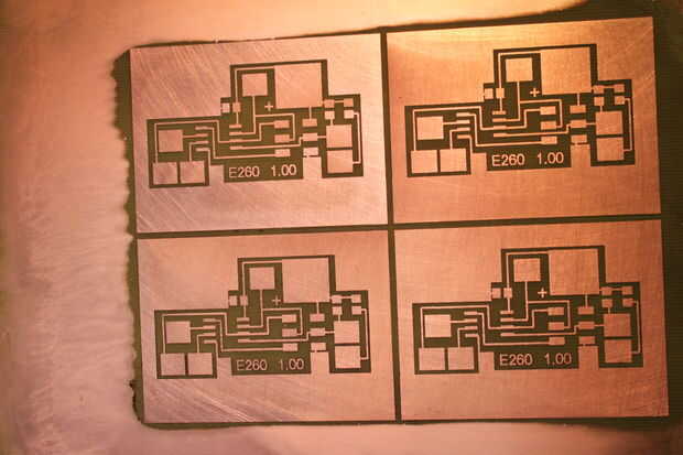 Arriba se muestran grabados que hice uso de esta impresora. Se puede ver en el cierre hasta cómo de densas son las áreas sólidas y sólido cómo son las 10 huellas de mil.