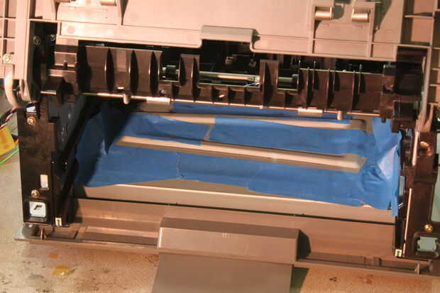 Deben cubrir las aberturas del mecanismo del laser. Utilicé tiras de cinta de dos pulgadas pintor para cubrir todas las aberturas. También cubrí las áreas donde los chips podrían lodge y causar problemas más adelante mientras que impresión [Foto].