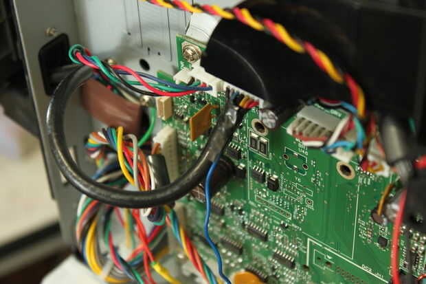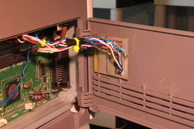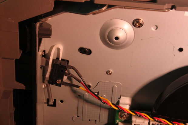 Corte los cables del interruptor de la cubierta abierta [Foto] en el cuerpo y eliminar el conector J7 del tablero de la impresora. Es el cable negro, el pin 3 y el cable rojo del centro es de 5 volts. Pin 1 debe estar también conectado a la fuente de 5 voltios, de lo contrario la impresora va a pensar que la puerta está abierta.