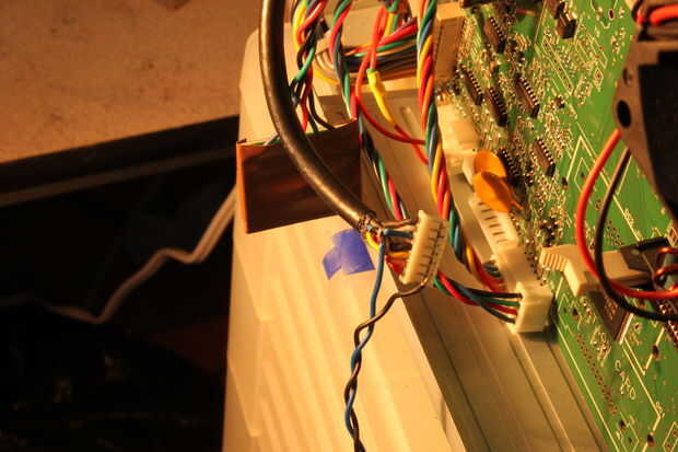 Como estamos usando el botón de cancelar (X) como nuestro nuevo MFP, tenemos que conectar nuestro controlador a J5, pin 5. Para hacer esto primero desconecte el cable de la puerta en J5. Con cuidado corte la cubierta aislante del cable para que tenga suficiente longitud de cable expuesto a llegar a los alambres individuales. Aislar el pin 5 y raspe con cuidado el aislamiento para dejar al descubierto el cobre [Foto]. Asegúrese de que usted está lo suficientemente lejos del conector para que si accidentalmente se corta el alambre tenga suficiente espacio para soldar nuevamente juntos! La soldadura de una longitud de 10 pulgadas de cable a pin 5 a continuación, utilice cinta aislante para cubrir la conexión como se muestra en la foto [Foto]. Finalmente soldar el cable con el botón indicado en la tarjeta controladora. Note que la señal en este pin es de 3,3 voltios, no de 5 voltios, pero funciona bien para esta aplicación.