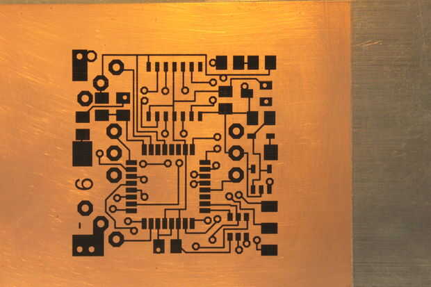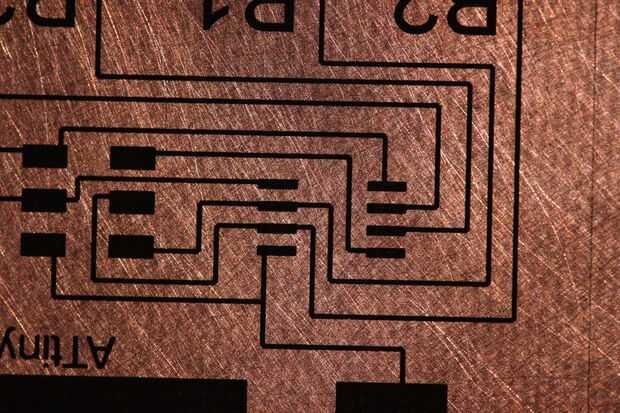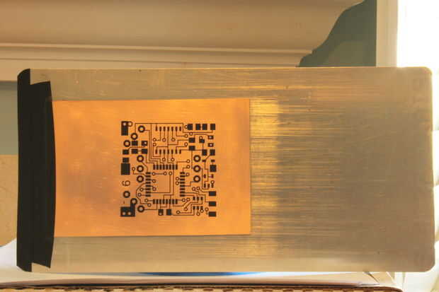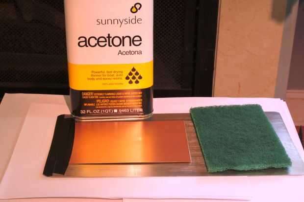 Jim Hutchinson, un compañero entusiasta de DLP, descubrieron que la forma más fácil de fijar el toner es sumergiéndolo en vapor de acetona. Colocar unas cucharadas de acetona en un recipiente. Suspender el PCB sobre el líquido (uso algunos espaciadores), cubrir el recipiente y dejar reposar 2-3 minutos. Luego retirar el PCB y dejar "aire" por un minuto o tan. El toner se ahora estar endurecido y al cobre. Ahora estás listo para grabar y utilizar su nuevo PCB.