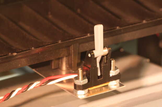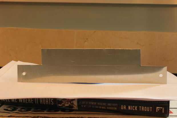 Ahora hacemos la nueva plataforma frontal para el montaje de PIS. Cortar una 8,875 "x 2" pieza de la 6 pulgadas ancho x aluminio.016. Siguiendo el dibujo [Foto], extienda y corte como se muestra usando tinsnips o un gran par de tijeras. Perforar dos pulgadas.172 agujeros donde indica [Foto]. Cuando montado completamente, la palanca de PIS debe moverse libremente [Foto]. Ver los dibujos y fotos para más detalles.