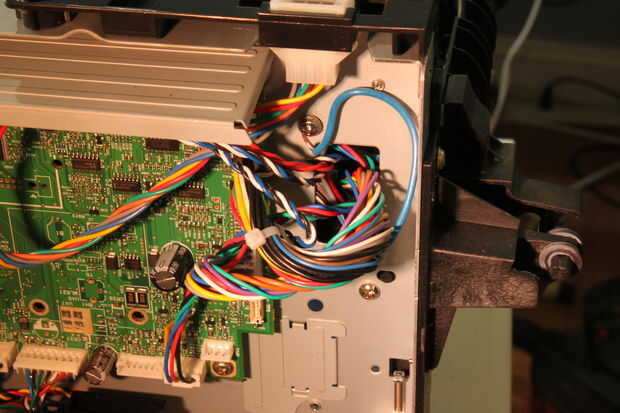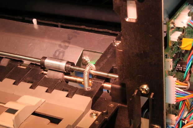 * Reemplazar el disco de engranaje Motor principal (SM). El engranaje grande con el gran resorte helicoidal se puede quitar y desechar. Fue utilizado para conducir al fusor y no es necesario. Tenga cuidado de conectar el cable del motor. El enlace del fusor pasa a través de la ranura en el frente de la impresora. Más tarde se unirá a la puerta. Usted puede tener a "mover" lo un poco para conseguir los engranajes de acoplamiento, pero la Asamblea debe deslizarse fácilmente en su lugar. No lo fuerce!