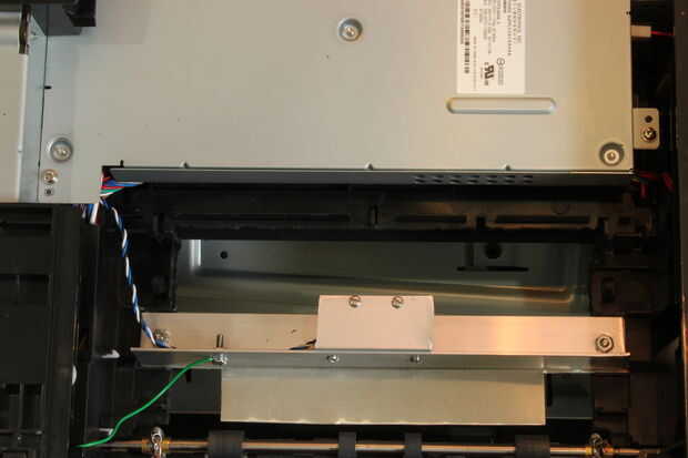 Ruta el suelo de alambre por el orificio grande en el lado derecho de la impresora como se muestra en la foto y asegure el cable de tierra a la caja de la impresora de metal usando un rescatado rosca tornillo en el agujero como se muestra [Foto]. El tornillo cortará su propia rosca a medida que gire.