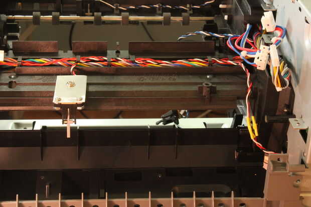 * Instale el nuevo Sensor de salida para el más central (izquierda) Duplex Asamblea resalto de montaje ubicado en el borde posterior de la plataforma de papel, usando el tornillo que guardó cuando usted quita la Asamblea Duplex [Foto]. Asegúrese de que está orientada correctamente. Encaje el cable en el canal de cable con el Motor principal de los cables, luego traer a través del orificio cerca de la esquina de la unidad. Enchufe el conector en el receptáculo de salida Sensor (J-14) en la tarjeta controladora.