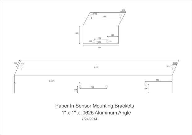 Vamos ahora a hacer la nueva placa de montaje y la plataforma para el papel de Sensor (PIS). Ver los dibujos y fotos para los detalles [fotos]. Corte un pedazo de 2 pulgadas de ángulo de aluminio de 1x1x.062. Taladre dos agujeros de.125 pulgadas a lo largo del borde inferior de un lado,.125 pulgadas desde el borde y.750 pulgadas aparte. Estas se utilizarán para montar los PIS [fotos].