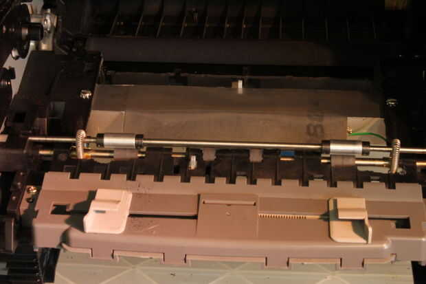 El E260 tiene 3 sensores que se utilizan para controlar la ruta de acceso a través de la impresora. La primera, Manual de alimentación de papel Sensor (MFPS) detecta la presencia de un objeto en los rodillos de alimentación Manual. Cuando lo consigue, los rodillos de entrada ejecutan durante un segundo o así para extraer lo PCB en los rodillos. Después de "Imprimir" se hace clic en el equipo, el segundo sensor, el papel de Sensor (PIS), baja cuando el PCB lo alcanza. Este sensor inicia el ciclo de impresión real. El final del sensor, el Sensor de salida (ES), baja cuando salga de la JCP la impresora. Si estos sensores no son golpeados en el momento correcto la impresora "jam" y una luz de error. En este paso guardaremos el MFP original, quitar y reemplazar el PIS y hacer y montar una nueva CE [Foto].