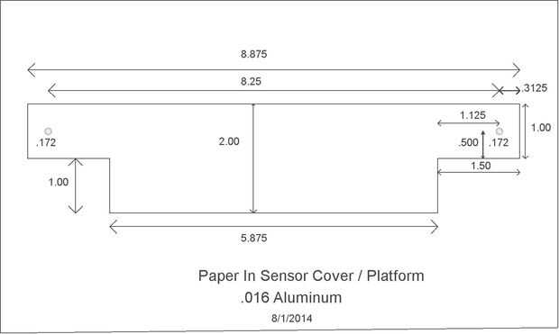 * El Sensor de salida original se encuentra en la Asamblea de fusor y es bastante débil. Vamos a hacer una nueva. Corte 1 "x 2" pieza de hoja de aluminio.016 para utilizar como montaje del Sensor de salida [Foto]. Vamos a utilizar el Sensor original de dos caras en lugar del sensor de salida porque es mucho más robusta y se adapta perfectamente. Utilice tornillos y tuercas 4-40 para montar el Sensor de dos caras, utilizando una tuerca como un espaciador, para montar con los cables hacia el agujero grande como se muestra [fotos].