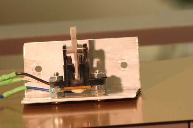 Taladre dos agujeros de.125 pulgadas en la otra pata del ángulo,.5 pulgadas desde el borde y 1,5 pulgadas aparte. Estas se utilizarán para montar el soporte para el soporte principal. Utilice una lima para suavizar los bordes y los agujeros, luego Monte el PIS con los cables mirando en la esquina del ángulo. Utilice hardware de 4-40 con 2 tuercas como espaciadores debajo de los PIS.