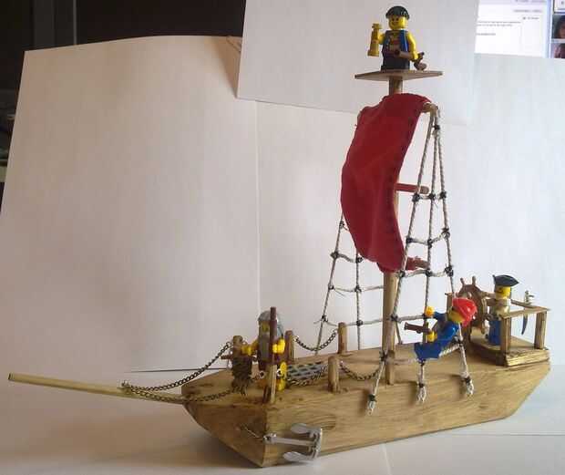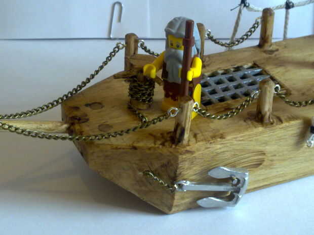 -El cabrestante está hecho de madera del té y agitadores del café con un agujero perforaron en el medio y un clavo insertado y martillado en la cubierta, luego una tapa para ocultar el clavo