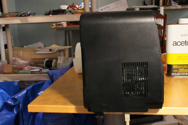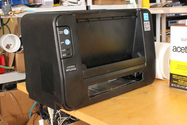 Experimentó con varias maneras de "levantar" la impresora en la superficie de la mesa mediante la adición de extensiones a las tapas laterales, pero finalmente decidieron que "más simple es mejor" y la forma más fácil es colocar la impresora en el borde de su escritorio o mesa y dejar que el USB y los cables de alimentación cuelgue sobre el borde. Sólo tenga cuidado de no empujar la impresora de escritorio!