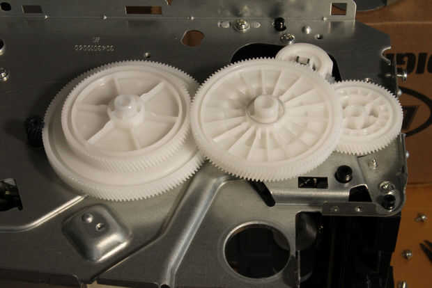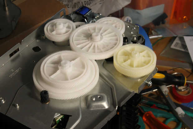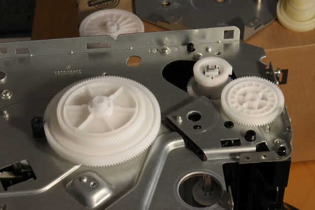 la caja de cambios. Coloque la impresora caja de cambios hacia arriba. Quitar los 4 tornillos de montaje, entonces para levantar cuidadosamente la lámina de recubrimiento. Tenga en cuenta adónde los engranajes para que usted puede volver a montar la caja de cambios más adelante. Ver las fotos.