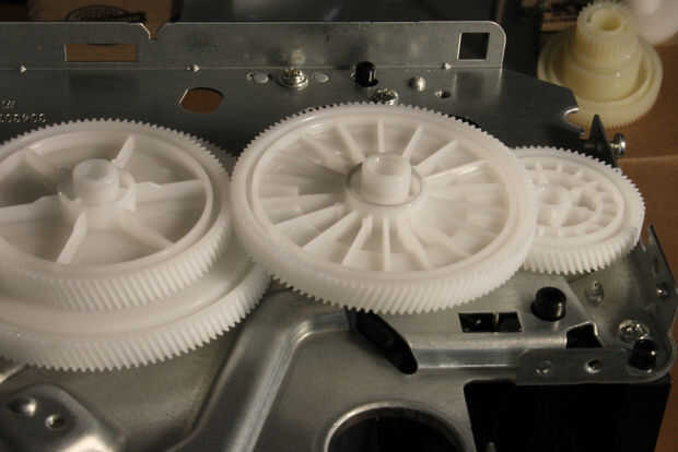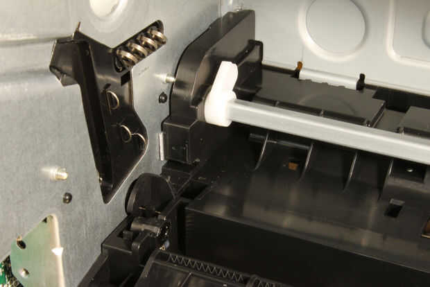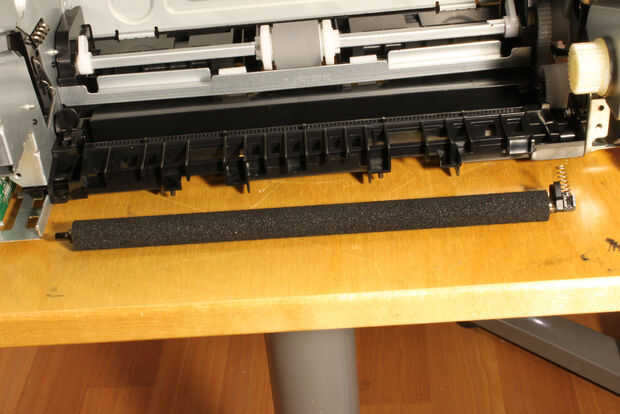 Baje la parte frontal de la impresora. Gire el blanco en el lado del engranaje de eje cuadrado y pop el clip fuera de su ranura en el eje de modo que se deslice libremente sobre el eje. Extraiga el vástago flojo, primero desde el extremo de la caja de cambios, luego invertir dirección y tire completamente libre de dentro de la impresora. No tienes que quitar la rueda recogedora de papel centro. Retirar la parte plástica del mecanismo de recolección con los dos pequeños muelles y descartar todas estas partes.