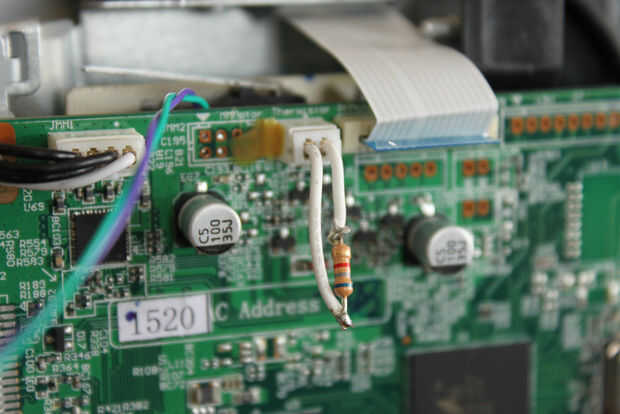 Ya que no usaremos al fusor, necesitamos utilizar una resistencia de "tonto" la impresora en el pensamiento de que el fusor está conectado y listo para ir. Afortunadamente, el valor de la resistencia no es crítico y hará cualquier cosa, desde 5K a 10K ohms - usé una resistencia de 6,8 K. Conecte la resistencia en el cable del termistor, y luego cubre la resistencia y conexiones con termocontraíbles o cinta aislante y enchufarlo en J13.