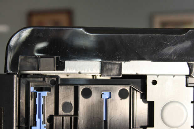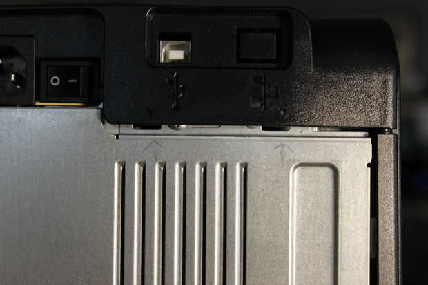 Retire la tapa del lado derecho. Este es el lado con el Panel del operador en la parte superior. Coloque la impresora en el lado izquierdo, poner un destornillador debajo del borde de la tapa entre las flechas realzadas en la parte posterior del panel (foto), luego pop los clips de las ranuras. No trate de quitar completamente la cubierta en este momento!