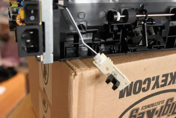 Quite el conector para el fusor. Este es el conector blanco grande justo debajo de la placa verde. Corte el cable cerca del fusor. Retire el cable del termistor en J13. Se encuentra justo a la izquierda de la pequeña FFC (Cable plano Flex). Corte los dos cables blancos cerca del fusor, dejando por lo menos una pulgada de alambre conectado al cable. El termistor se encuentra en la Asamblea de fusor. Su trabajo consiste en medir la temperatura del fusor para que el controlador puede mantener al fusor caliente para "fundir" el toner al papel. No utilizaremos al fusor, por lo que se puede descartar. Pero asegúrese que el cable del termistor.