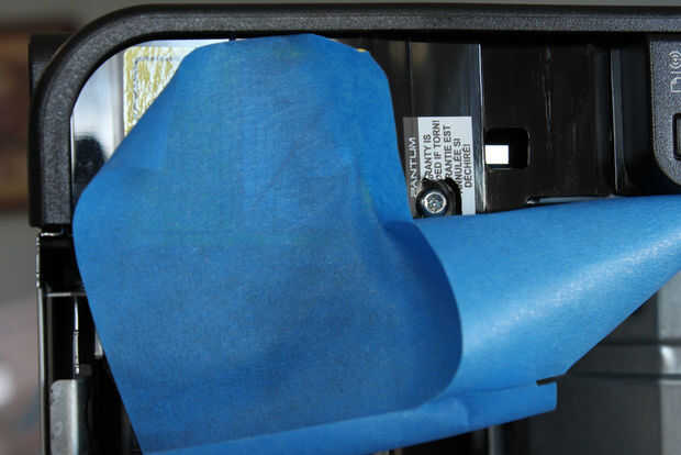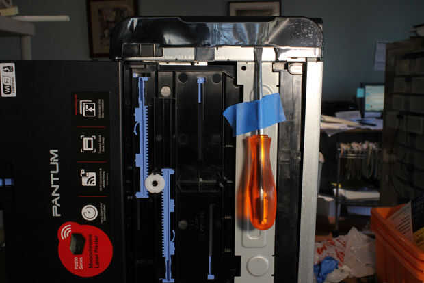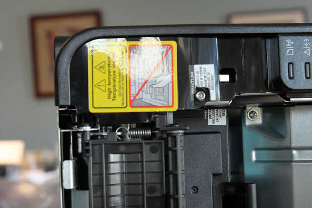 Quite el tornillo localizado en blanco y negro etiqueta de advertencia en la parte superior derecha, justo en frente de la etiqueta amarilla de advertencia. Esto es una especie de tornillo de seguridad, y no tengo nada que encaja, usé una fábrica de carburo de 1mm en una Dremel fresar una ranura áspera en la cabeza del tornillo, luego utiliza un pequeño destornillador para quitarla. Utilice cinta para proteger por lo que los chips no cae en la impresora. Este tornillo no puede ser reutilizado.