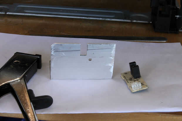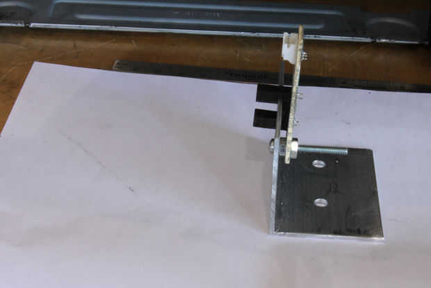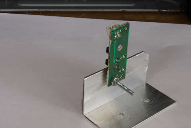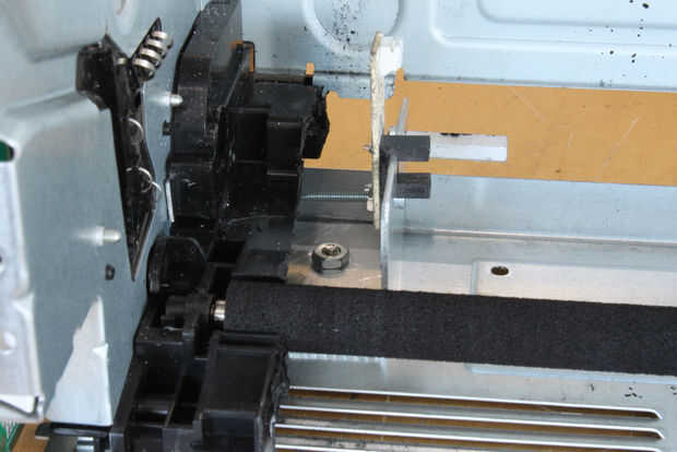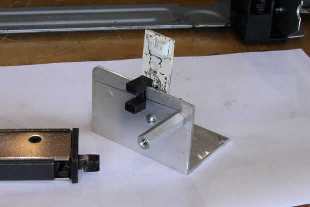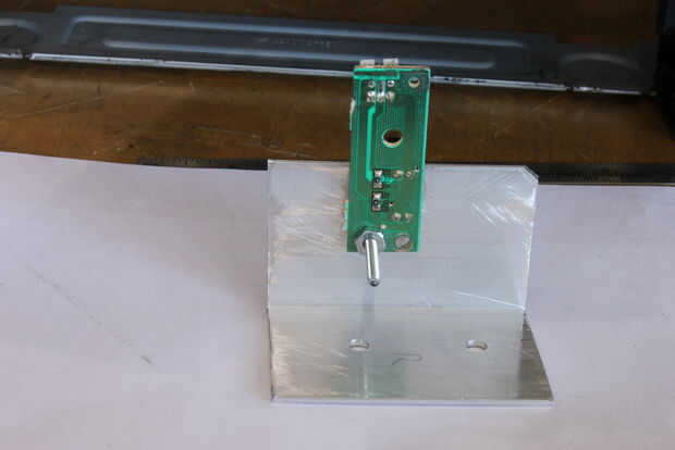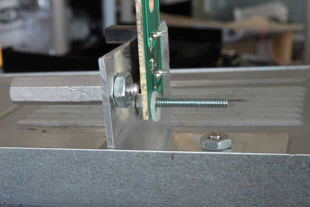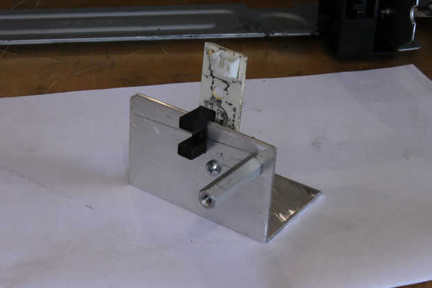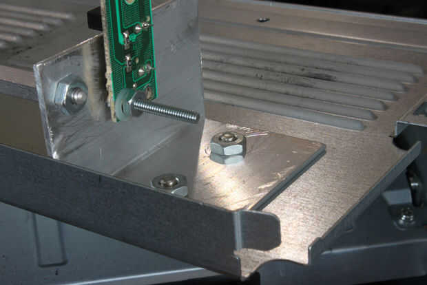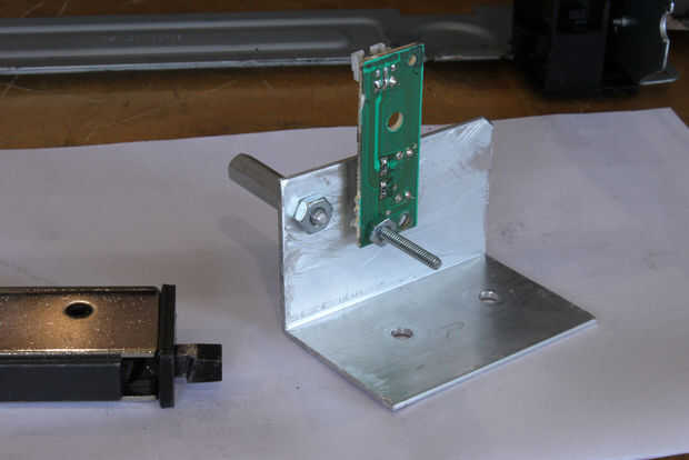 Utilice una herramienta de recorte o sierra para cortar una muesca amplia de.25 pulgadas a partir de cerca de 1 pulgada desde el extremo de la brida de la LCG derecha. La muesca debe estar cerca de.5 pulgadas de profundas. Deslice el Sensor en la ranura como se muestra, luego marque el centro del pequeño orificio en la parte posterior de la LCG. Taladre un agujero.125 pulgadas en la LCG, agrande el orificio en el tablero de Sensor a.125 pulgadas y montar el tablero de Sensor como se muestra, utilizando hardware de 4-40. Use una tuerca de 4-40 como un espaciador para mantener el PCB un poco lejos de la LCG. Esto mantiene el cuerpo del sensor detrás del plano de la LCG para que el portador lo borra. Utilice una arandela de plástico como se muestra para evitar que la tuerca usando a través de la capa verde en el tablero de Sensor.