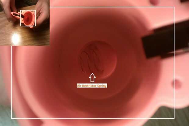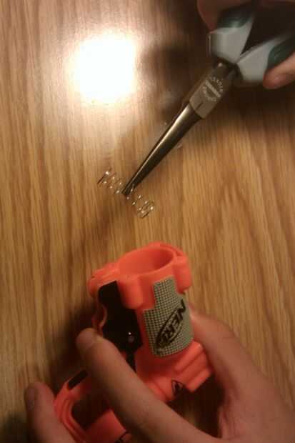 Con un par de alicates de punta saque el resorte más estricta re de aire desde el interior de la parte inferior de la pistola.