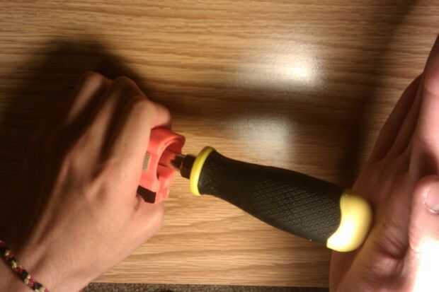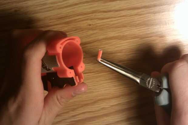 Con una cabeza plana alicates Destornillador y aguja rompen los tres puestos en la foto superior de la pistola. Esto se hace fácilmente por primera presión en el poste con el destornillador removiendo las piezas con los alicates.