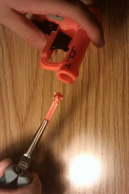 este Instructable muestra cómo doblar los tiros tiene una sacudida de Nerf, mientras que no agrega ningún barells extra,Paso 1: Reúna las herramientas y materiales Cuchillo o tijeras, sacudida de Nerf, dos optimizada o élite dardos Nerf, nada en el I