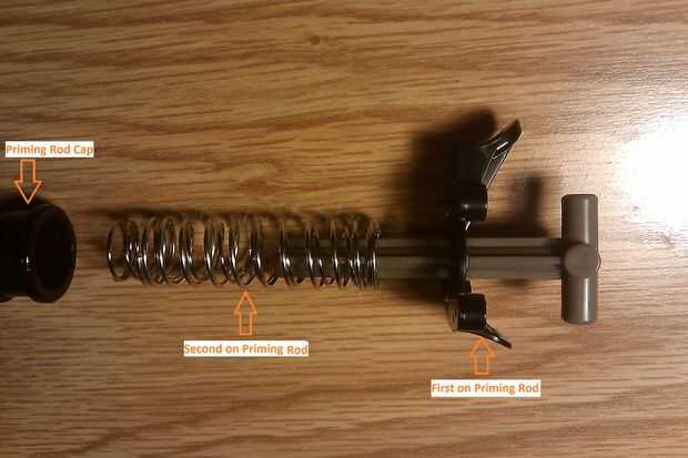 Reemplazar la tapa blaster en la varilla de cebado asegurándose de que esté correctamente orientado como en la imagen a continuación. Observe que la barra de cargado sí mismo ahora es paralela con la tapa de blaster. Luego poner el resorte doble en la barra de cebado y finalmente la tapa de la varilla de cebado.