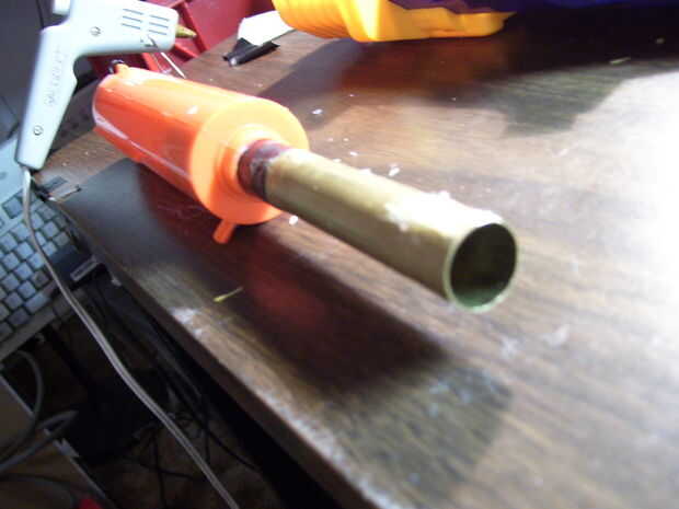ahora toma el tubo de latón de 5/8 de pulgada y péguelo sobre lo negro. Asegúrese de que su agradable e incluso y se ahorrará u un montón de problemas. usé el epoxi para esto. también ayuda si usted tiene un poco de PETG o algo que se ajuste dentro lo ayudarán a mantenerse incluso.