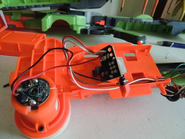 Para acceder al motor, empuje cadge y motor impulsor primero deberá desconectar la parte delantera del cuerpo quitando un tornillo situado debajo de la cadge externo (en la cáscara de la pistola). Luego levante suavemente el cuerpo y otros componentes internos de la base de la pistola. (Nota: usted tendrá que cortar los cables de los gatillos, se muestra en la foto 3). La foto 4 muestra el funcionamiento interno quitado, y la 5 º foto muestra motor y empujador cadge.