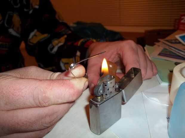 1. Calentar el extremo de la patilla con el mechero hasta que se caliente que brilla intensamente rojo.
